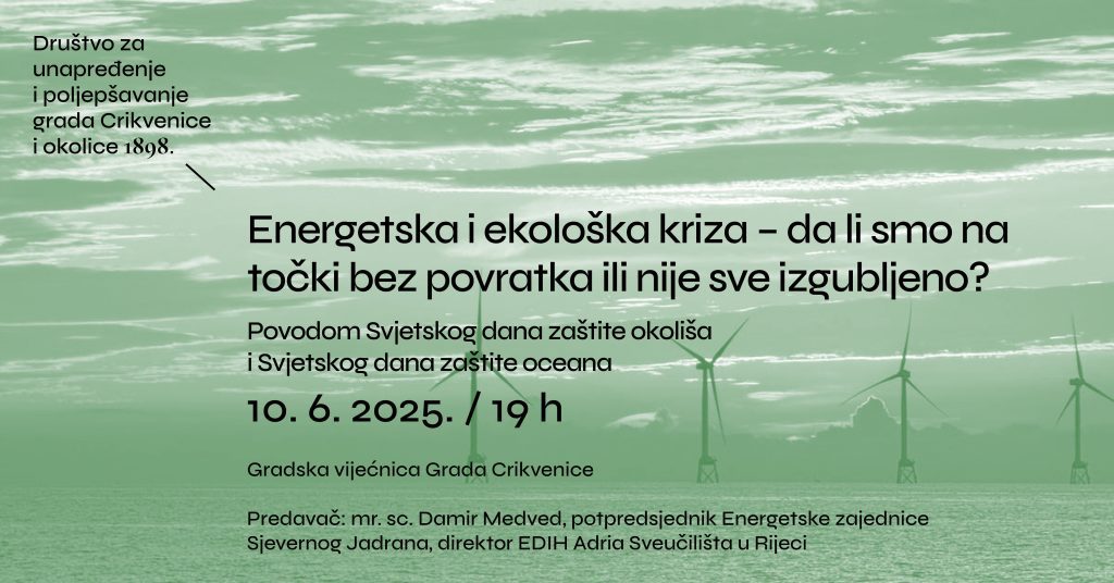 Povodom Svjetskog dana zaštite okoliša i Svjetskog dana oceana, Društvo za unapređenje i poljepšavanje grada Crikvenice i okolice 1898. (DZUIP1898) poziva sve zainteresirane na javnu tribinu na temu: „Energetska i ekološka kriza – da li smo na točki bez povratka ili nije sve izgubljeno?“ Cilj programa je povezati struku, upravna tijela i stanovništvo crikveničkog područja, kao i ostalih gradova i općina, u zajedničkom djelovanju na podizanju kvalitete življenja i održivom razvoju destinacija.